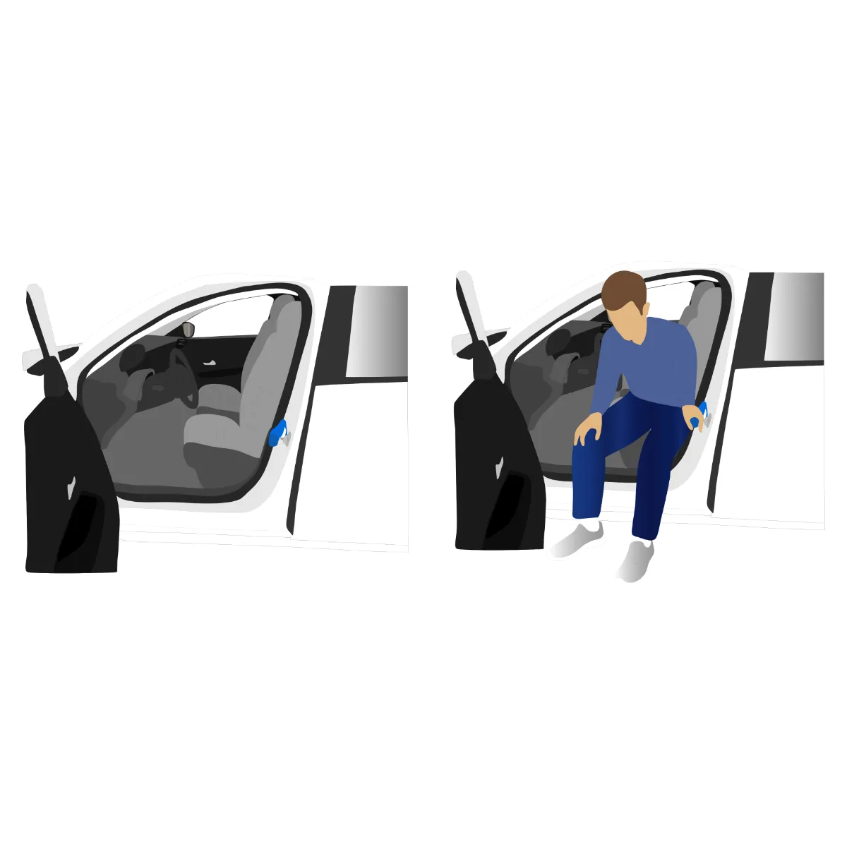 Les transferts vers et hors de la voiture peuvent être compliqués par une faible hauteur d’assise ou une faiblesse musculaire au niveau des membres inférieurs. Un appui sûr et stable au niveau des membres supérieurs facilite grandement ce transfert.