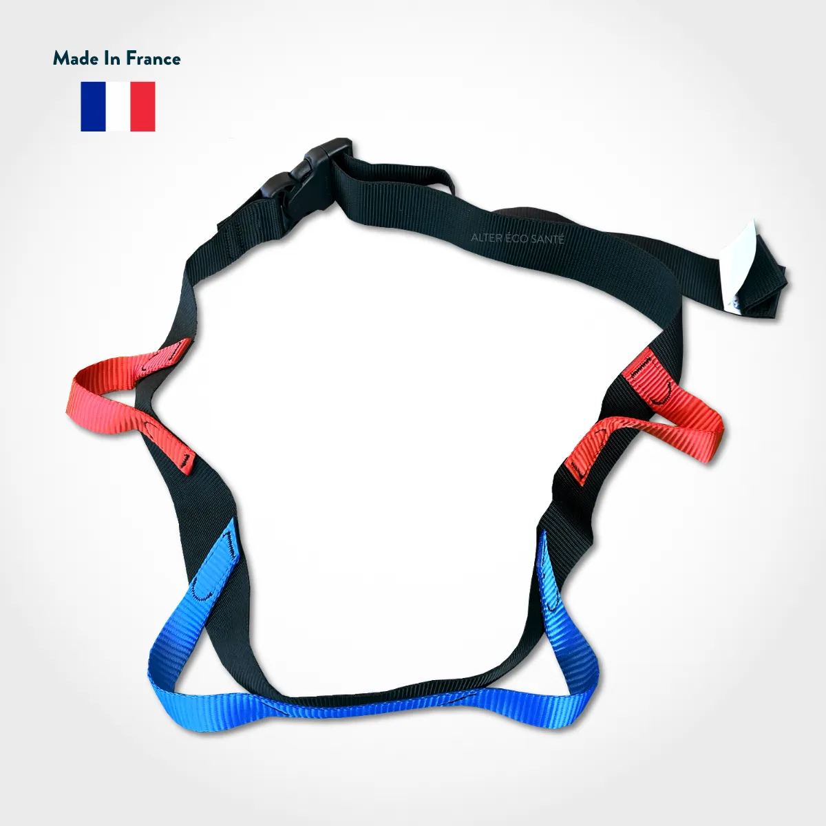 GERIAMAX® est une ceinture de transfert ajustable composée de 4 poignées, 2 rouges et 2 bleues.