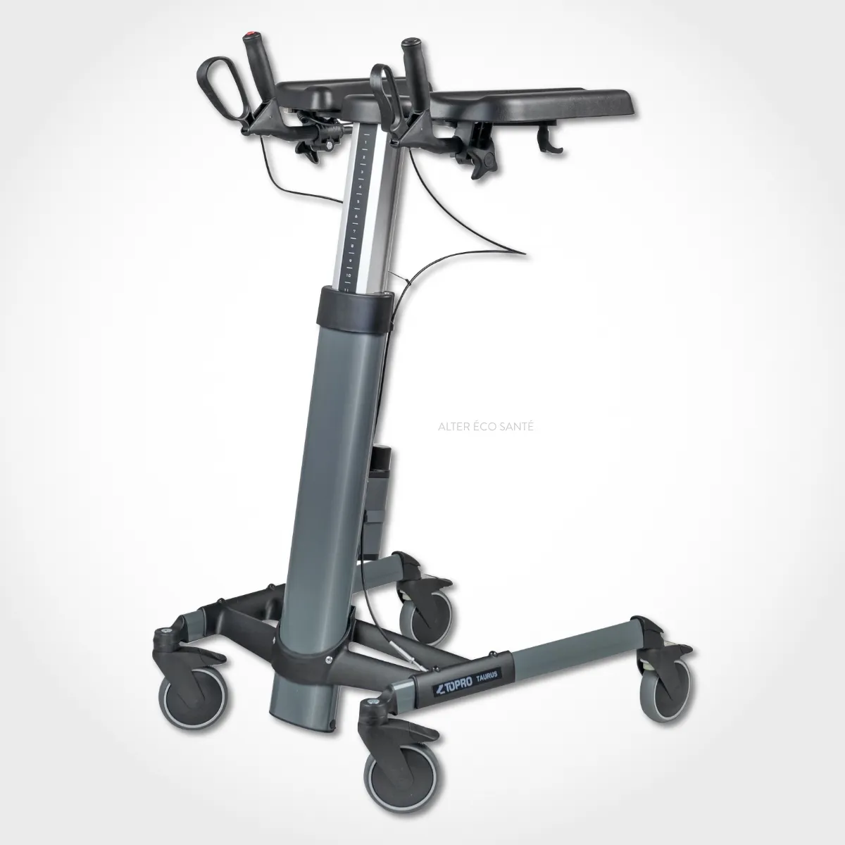 Le TAURUS E PREMIUM® est un déambulateur équipé d’un système de réglage éléctrique de la hauteur du cadre de marche et d’appuis brachiaux. Les poignées sont réglables et disposent de freins de stationnement pouvant être actionnés indépendamment l’un de l’autre. Les roues arrières sont composées de pédales permettant un blocage directionnel. Le TAURUS E PREMIUM® apporte un soutien à l’aidé lors de la verticalisation, pour la marche ou encore la station debout.