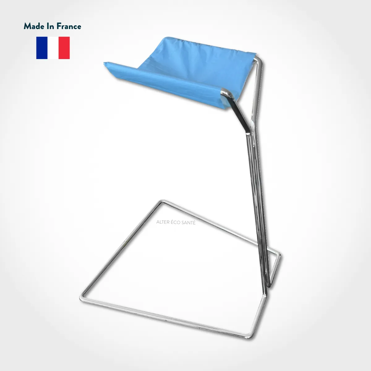 La potence de suspension talonnière est constituée d’un pied en acier chromé et de hamacs à enfiler à usage unique.