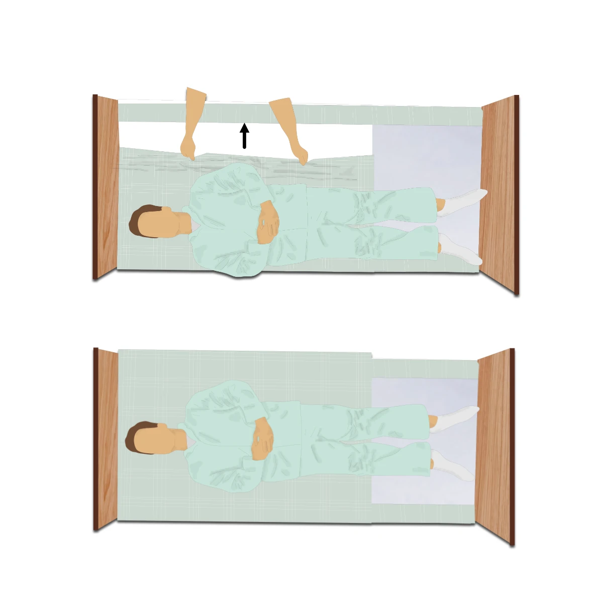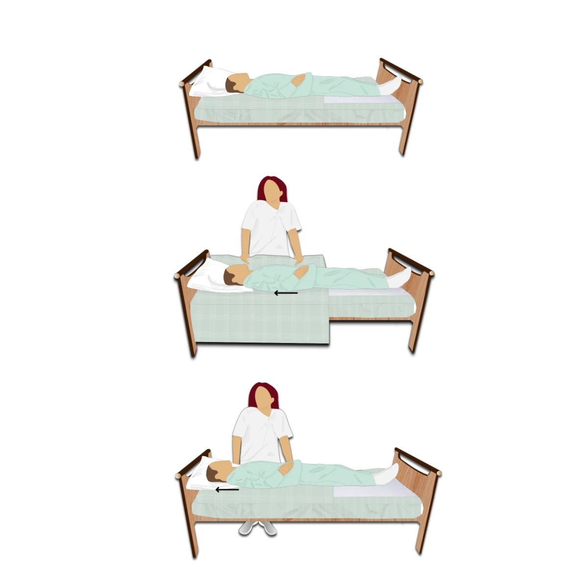 Indiqué pour les sujets présentant des difficultés pour réaliser un mouvement en position allongée. Recommandé pour les personnes à mobilité réduite ou nulle. Border le drap de dessus entre deux mobilisations.