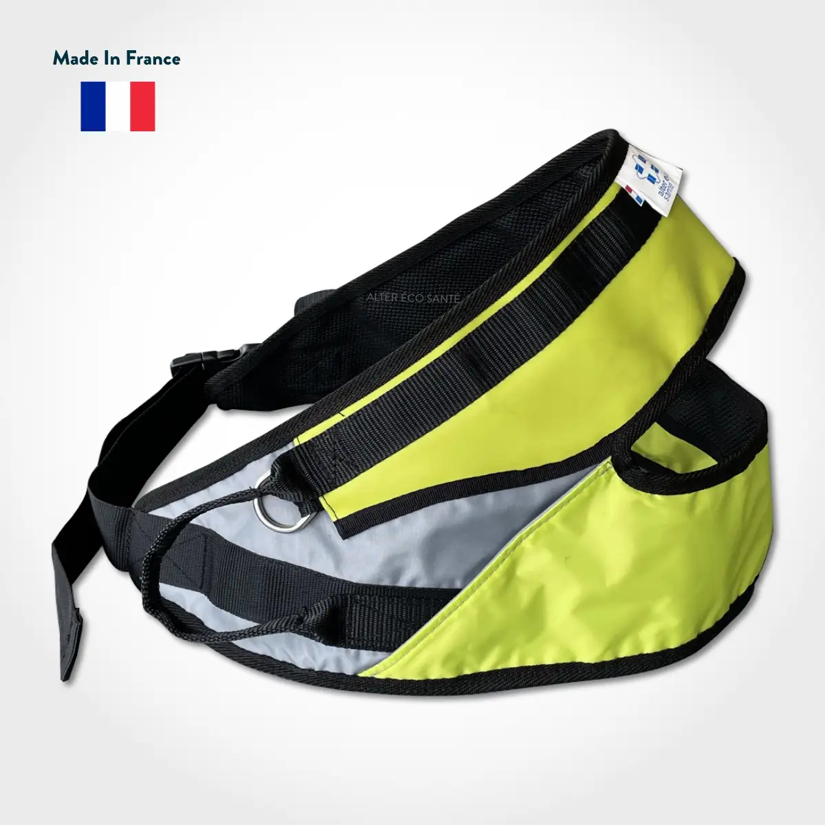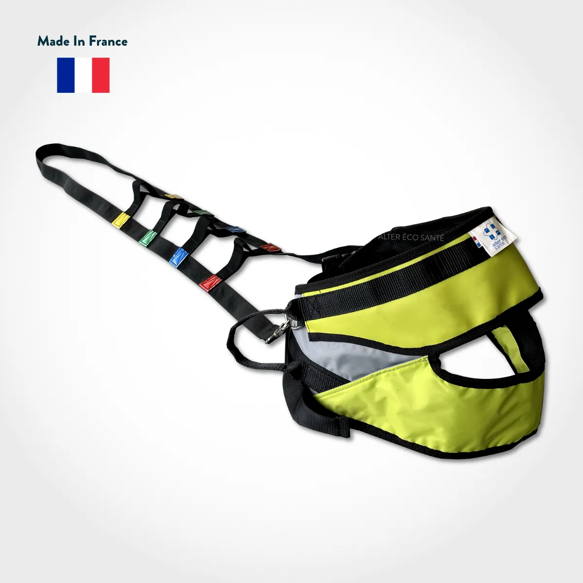 Le dispositif est ajustable à la taille grâce à la ceinture ARTUR® et s’accroche sur le guidon par l’échelle VERTIGRAD®. L’aidant peut par exemple déplacer le patient et l’installer aux toilettes. Sinon, en remontant la partie basse de la ceinture sur la partie haute, le déshabillage et l’accès au siège sont grandement facilités pour un change debout