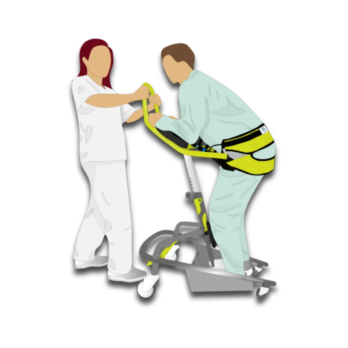 Manutention manuelle par une tierce personne, pour accompagner et sécuriser la verticalisation D’un sujet présentant une incapacité de verticalisation manuelle. Indiqué pour une utilisation en complément d’un guidon de transfert déplaçant.